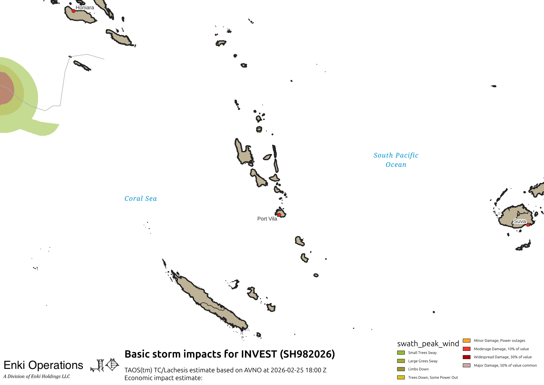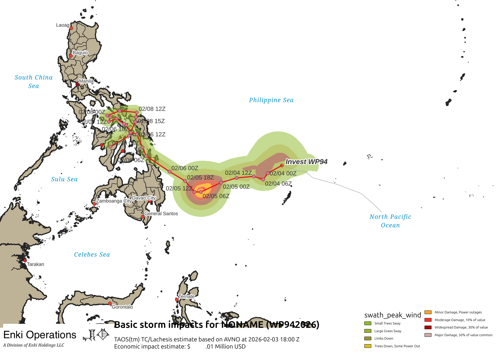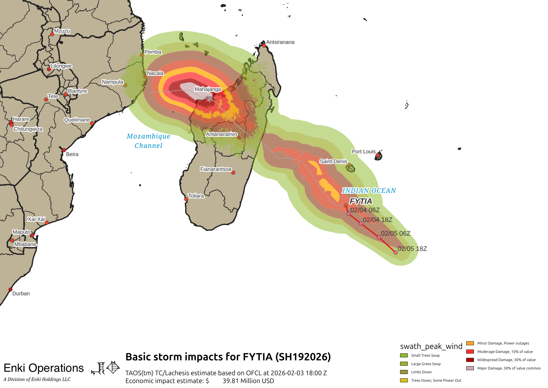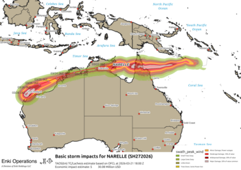The third map shows the result of a simulation of the storm using my TAOS(tm) storm hazard model, with the colored areas showing the potential impacts in plain English (eg "Large Trees Sway" or "Widespread Damage"). The estimated economic impact from my Lachesis economic model is also indicated, in US Purchasing Power Parity Dollars.