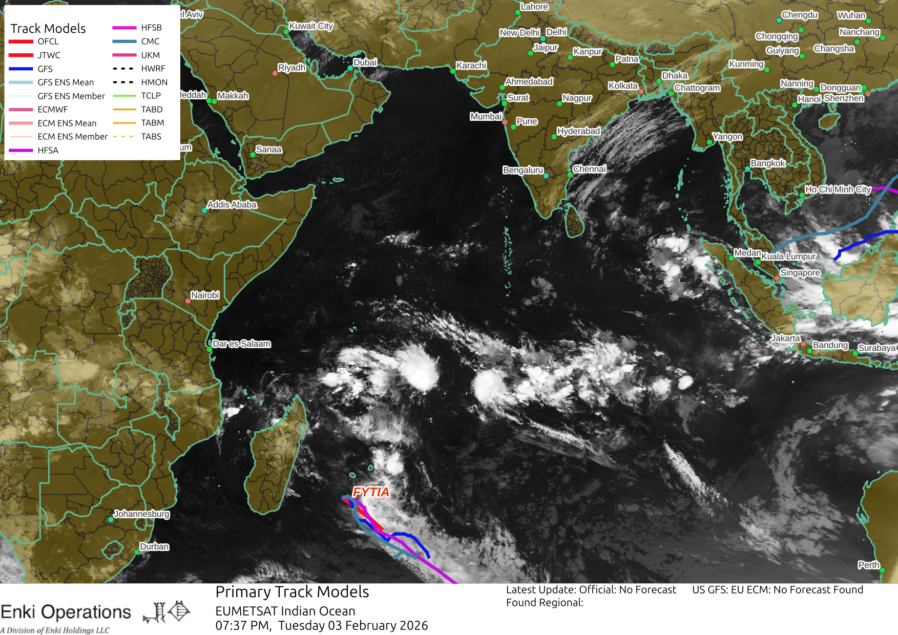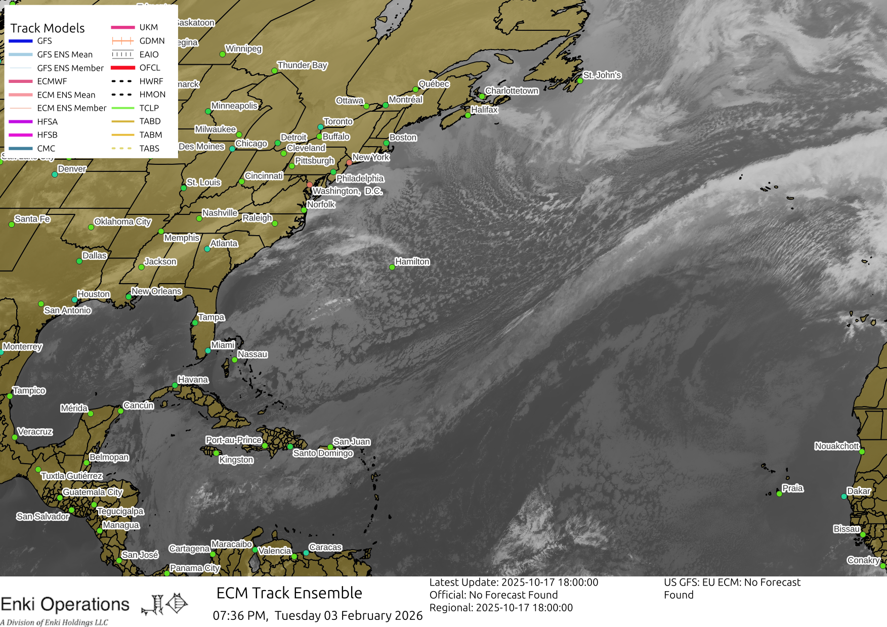 These are the infamous spaghetti model maps showing the tracks generated by various computer models. Five sets of maps are shown here, one for each major hurricane/tropical cyclone basin. The first set are all of the primary models. The second set are just the global forecast models (GFS, ECM, CMC, etc). The third are dedicated regional models such as the HFSA/B system, the older HWRF and HMON models, as well as Trajectory models derived from GFS. The green line (TCLP) is a statistical model that only uses the current position, heading, and historical storm tracks to do a forecast. This tells you what storms in the past have done, and is an indication of how difficult the forecast is for this storm (if the dynamical models deviate a lot from the green line, that means the storm is more difficult to forecast than if they are going the same general direction). The final two sets of maps show the ensemble runs for the GFS and ECM models. These are simulations that have different starting condtions to provide an idea of how much uncertainty there is in the forecast.