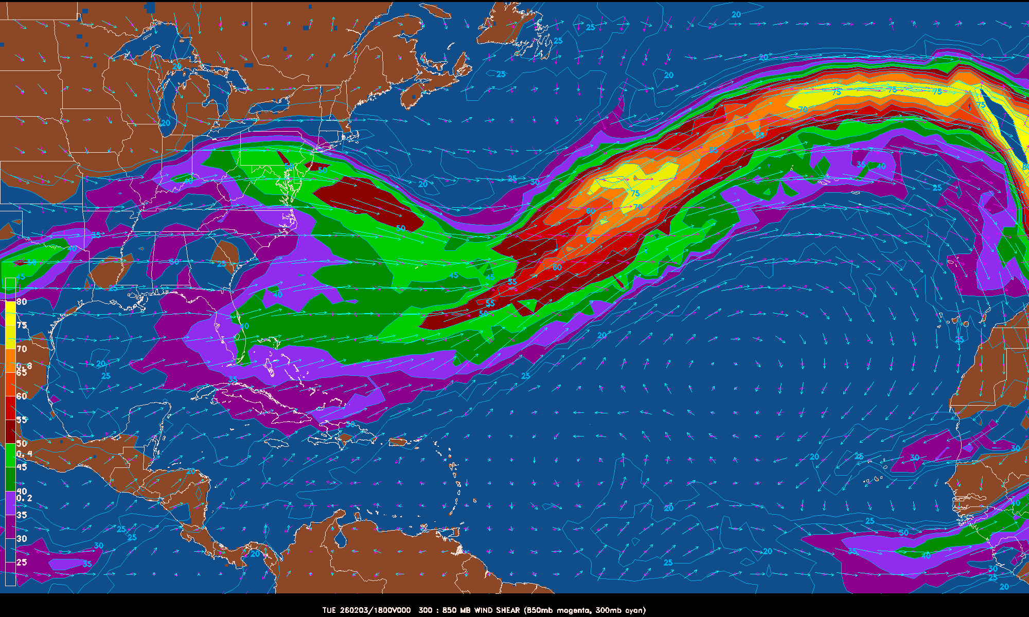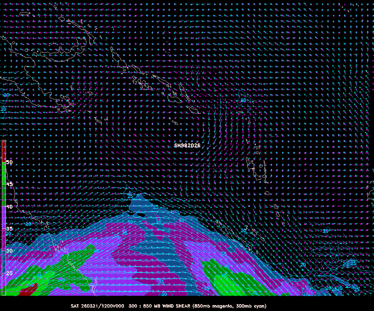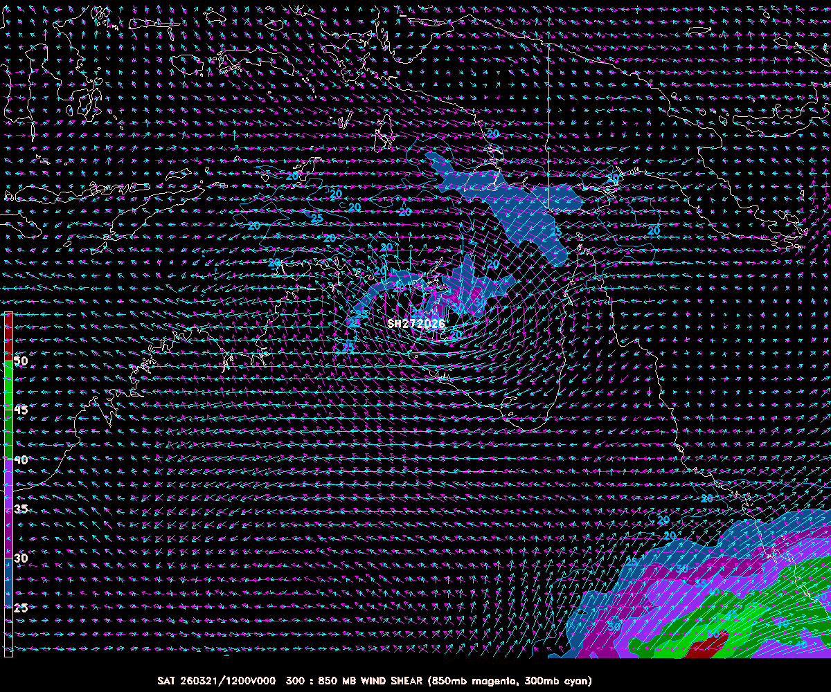 The first map is a GEMPAK map showing the surface winds and 850mb pressure heights from the GFS initialization run for each storm. This is a good indication of the organization of the storm. A well organized storm will have a nice circular pattern to the H850 (yellow lines), and winds centered over them. The second map is also a GEMPAK map of the wind shear around each storm, showing the difference between the low altitude (850mb, about 5,000 ft up) and high altitude (300mb is around 30,000 ft) winds. Colored areas are of high shear, generally unhealthy for tropical cyclones.