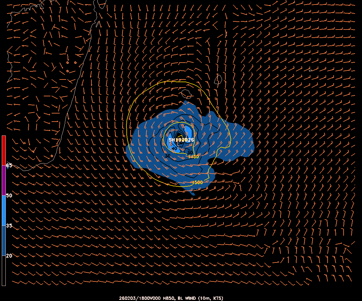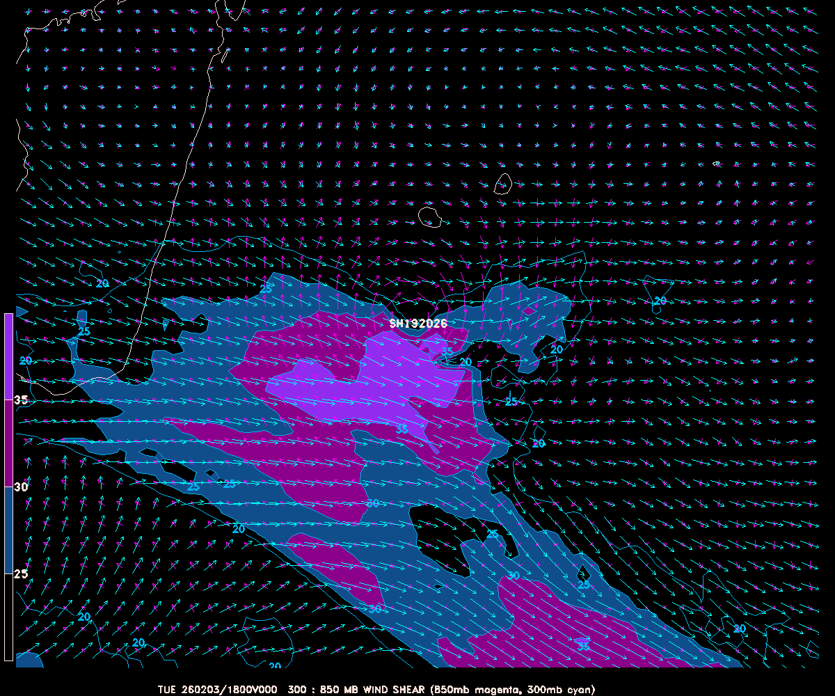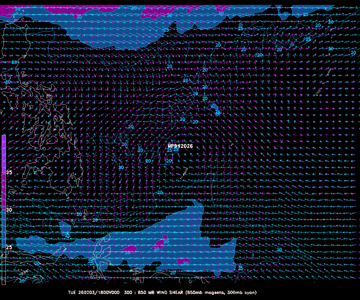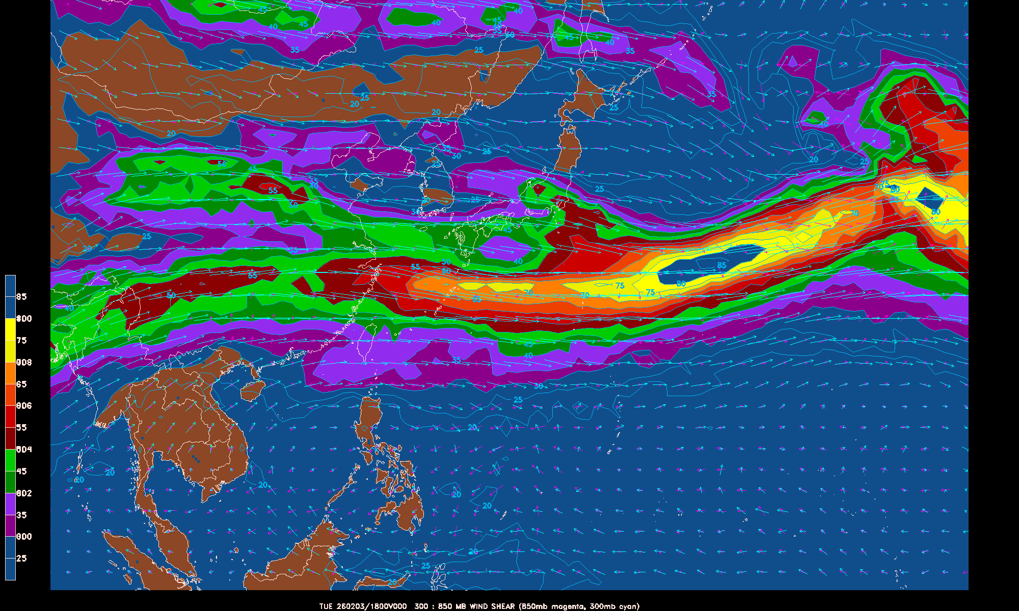 The first map is a GEMPAK map showing the surface winds and 850mb pressure heights from the GFS initialization run for each storm. This is a good indication of the organization of the storm. A well organized storm will have a nice circular pattern to the H850 (yellow lines), and winds centered over them. The second map is also a GEMPAK map of the wind shear around each storm, showing the difference between the low altitude (850mb, about 5,000 ft up) and high altitude (300mb is around 30,000 ft) winds. Colored areas are of high shear, generally unhealthy for tropical cyclones.